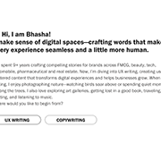 I’m a creative strategist and copywriter with over nine years of experience crafting stories that connect — from FMCG and beauty to tech, automotive, pharma, and real estate. My work spans big ideas for campaigns, brand voice development, and, more recently, UX writing that shapes intuitive, human-centered digital experiences. I thrive on distilling complexity into clear, engaging narratives that help brands stand out and audiences feel understood. When I’m not immersed in creative work, you’ll find me behind a camera in nature, exploring art galleries, reading, traveling, roller skating, or simply getting lost in good music. Whether you’re here to explore my UX writing or my copywriting, you’ll find stories shaped with intent, clarity, and a little spark.